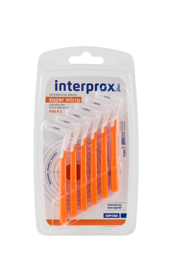 Interprox Plus Super Micro Oranje is speciaal ontwikkeld voor het reinigen van de ruimten tussen tanden vóór in de mond. Cariës (gaatjes) en tandvleesontstekingen beginnen vaak tussen tanden en kiezen. Deze ruimte reinig je het meest effectief met een interdentaal borsteltje. Een borsteltje is effectiever dan tandenstokers of rubbersticks. De borsteltjes van Interprox zijn voor dagelijks gebruik en gaan langer mee. Omdat de interdentale ruimten tussen tanden en kiezen varieert, is het belangrijk om voor iedere specifieke situatie het meest geschikte borsteltje te kiezen. Vraag je mondzorgprofessional welke maat het meest geschikt is. Interprox Plus Super Micro Oranje heeft een gehoekt handvat en beschikt over een cylindrisch gevormde borstelkop met PHD maat 0.9.
